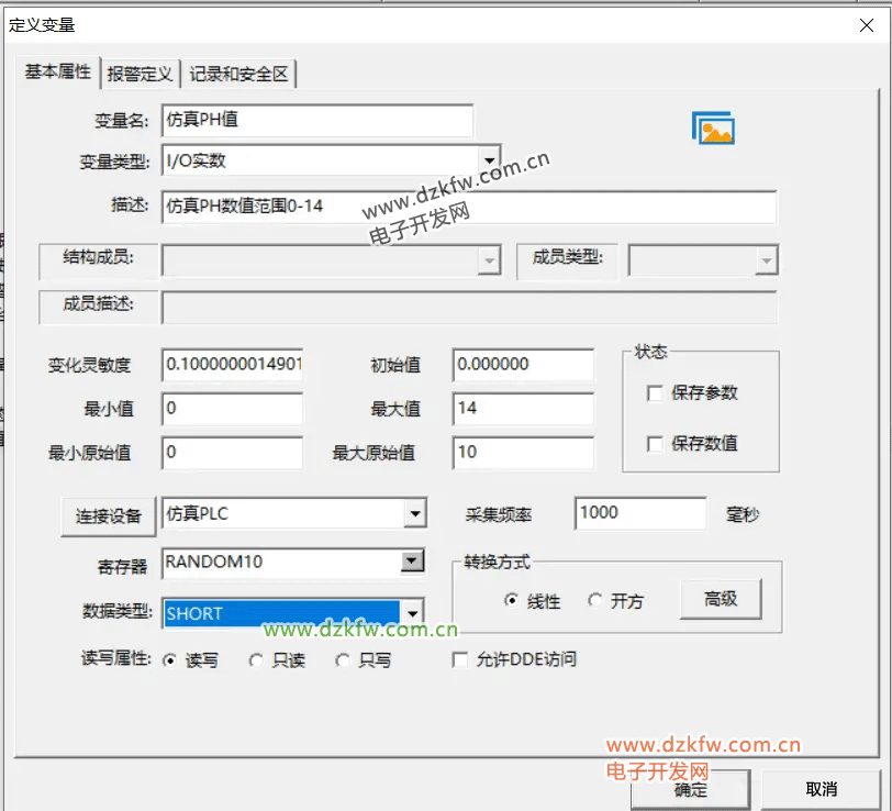 变量类型:I/O实数;变化灵敏度:0.1;初始值为0.0;最小值为0,最大值为14;寄存器选择随机函数RANDOM10 (表示随机值的范围是0-10);这个是最小原始值到最大原始值。
