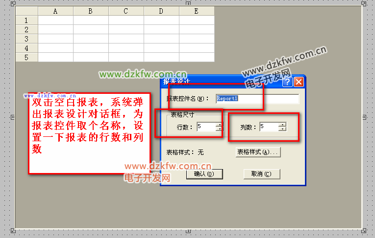 双击空白报表,系统弹出报表设计对话框,为报表控件取个名称,设置一下报表的行数和列数。如下:报表控件的名称Report1,报表的行数和列数都为5。然后点击确定完成设置。