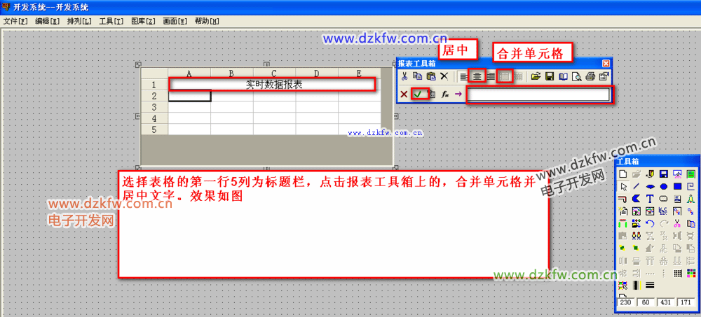选择表格的第一行5列为标题栏,点击报表工具箱上的,合并单元格并居中文字。效果如图