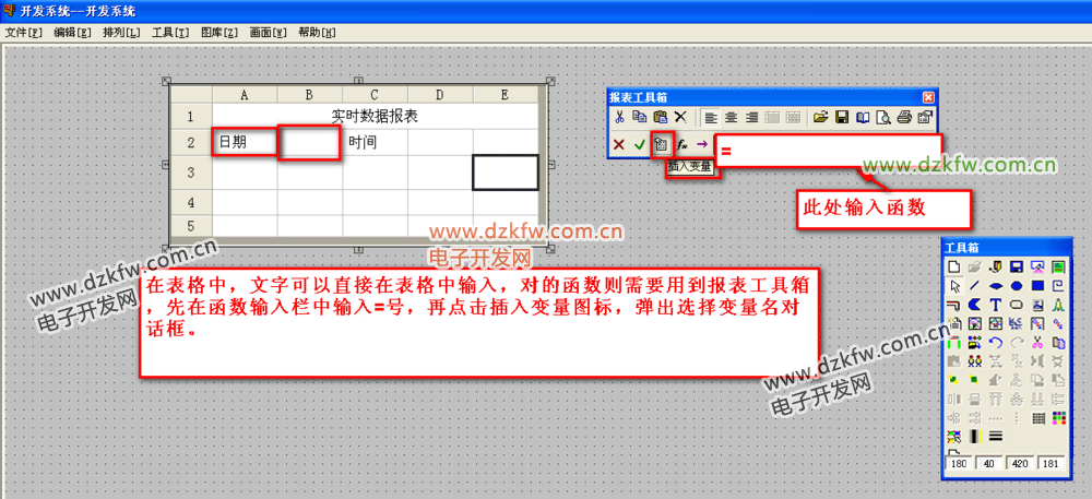 在表格中,文字可以直接在表格中输入,对的函数则需要用到报表工具箱,先在函数输入栏中输入=号,再点击插入变量图标,弹出选择变量名对话框。