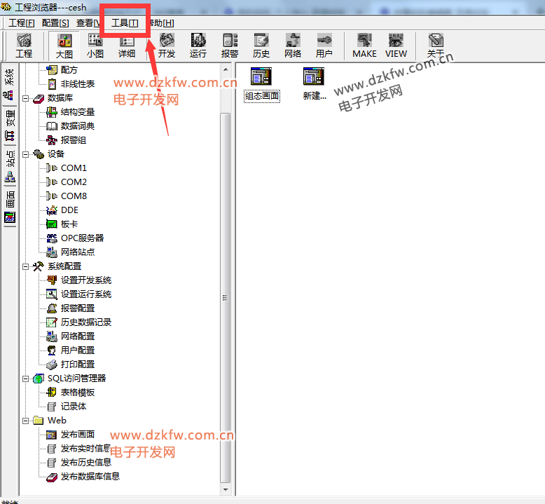 打开组态王工程浏览器,然后在菜单栏中选择【工具】
