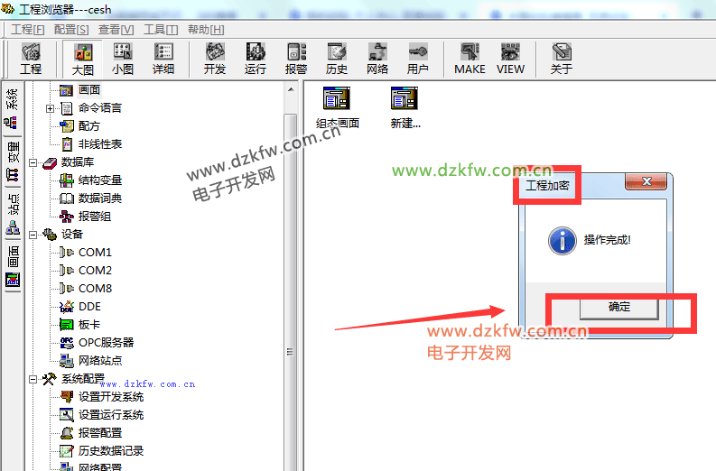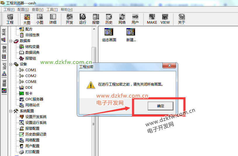 然后将开发系统中的所有界面关闭,并在弹出的工程加密对话框中选择【确定】