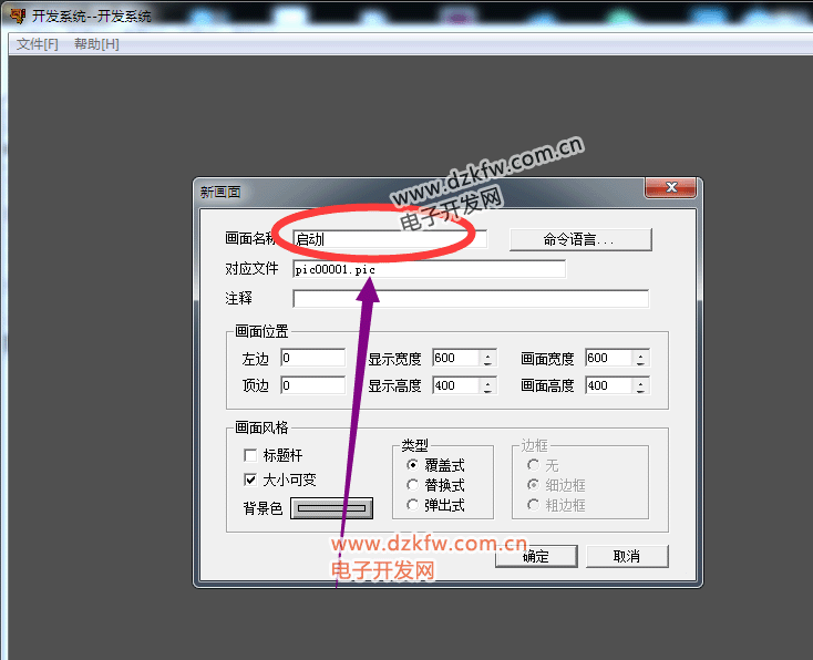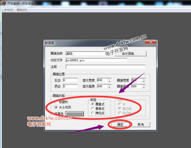 然后根据需要设置画面风格信息,并点击“确定”按钮进入内嵌的组态王画面开发系统。