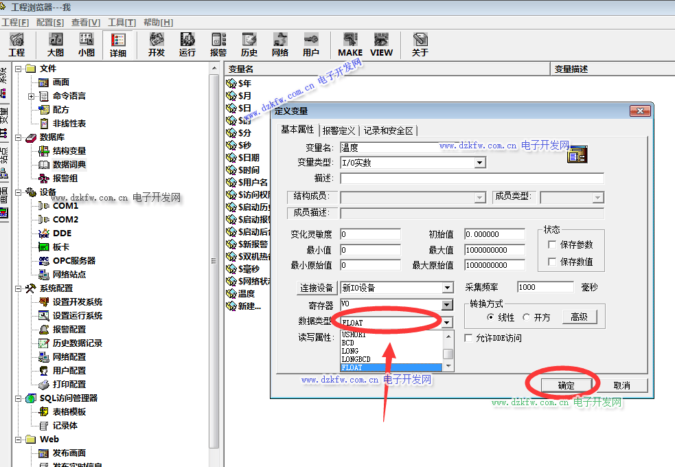 然后在弹出的定义变量窗口中,变量名输入为【温度】,变量类型选择【I/0实数】