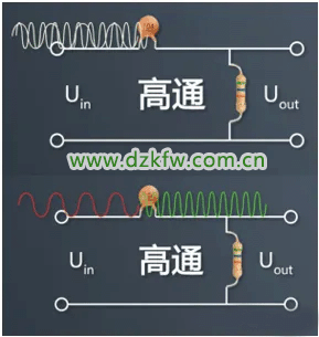 在高、低通滤波电路中,电容与电阻也是处于串联关系,由于电容的通高频阻低频作用,低频信号经过电容时产生的压降很大,根据串联分压,此时电阻得到的电压就很小,而电容电压即为输出电压。换言之,低频输入电压基本等于电容电压(输出电压)。同理,高频电压信号经过电容时产生的压降比较小,显然电阻分得电压就很大,此时就相当于高频输入电压没有输出,已被过滤掉。