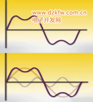 傅里叶级数是分析非正弦周期电路的有效方法,简单来说,就是将非正弦周期电压、电流信号分解为一系列不同频率的正弦量之和,这些不同频率的正弦量(正弦交流量)叠加又可以形成非正弦的周期量。我们以一个简单的波形为例,下图1-3所示,上半图为原信号波形,显然它不是正弦量,但它是周期量,这个周期波可以分解为下半图的两周正弦波。