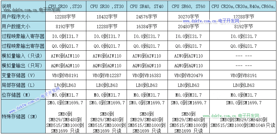 256 位输入(I)/ 256 位输出(Q)/ 56个字的输入(AI)/ 56个字的输出(AQ)/ 256位存储器(M)