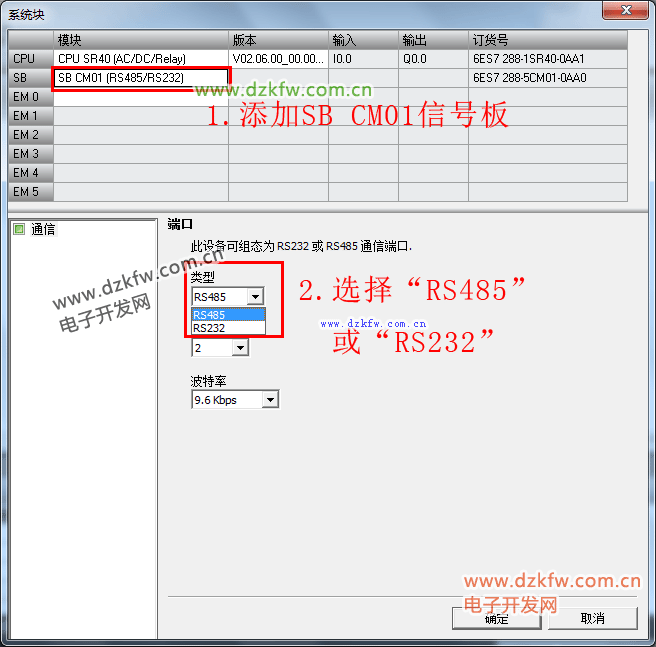 使用STEP 7-Micro/WIN SMART软件配置SB CM01信号板为RS485或RS232接口的过程如图“图3:SB CM01信号板配置过程”所示。