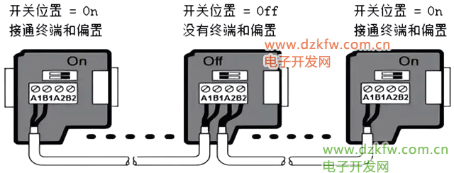 连接器上配备了两组连接端子,分别用于接入输入线缆和输出线缆。此外,连接器还设有终端和偏置电阻的切换开关。位于网络两端的通信节点需将连接器上的开关置于开启状态(On),而网络中间的通信节点则需将开关设置为关闭状态(Off)。