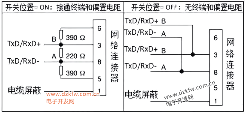 网络连接器终端电阻和偏置电阻的接线范例可参考表 4,详细说明了终端和偏置电阻的配置。