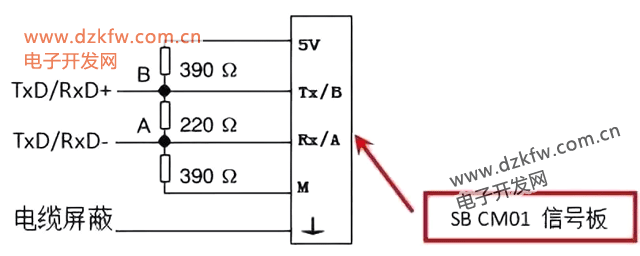 SB CM01信号板适用于RS485网络的接入。当信号板作为终端通信节点时,需要接入终端电阻并连接偏置电阻。典型的电路配置如图 7所示,详细说明了SB CM01信号板在终端和偏置电阻方面的接线布局。