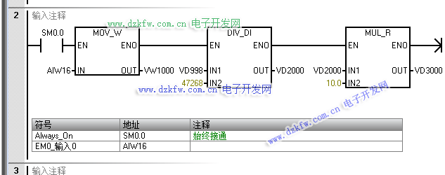 答:VW1000地址内的数据是字,不能用来做加减乘除计算。只有VD地址可以用来加减乘除计算。根据上一篇文章S7寄存器地址梳理,VD998就包含了VW1000的后两位,即数值上VD998=VW1000,所以用VD998来计算对用值