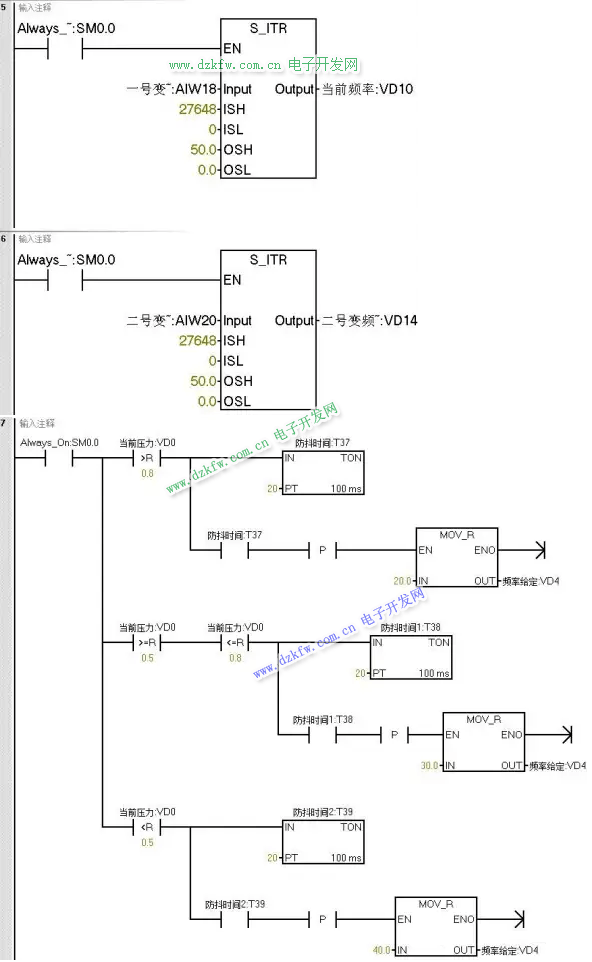 程序段 4 和 5 借助模拟量输入库文件,实现对当前压力值以及变频器频率反馈值的读取。通过这种方式,程序能够实时获取系统的关键运行参数,为后续的控制决策提供准确的数据支持。