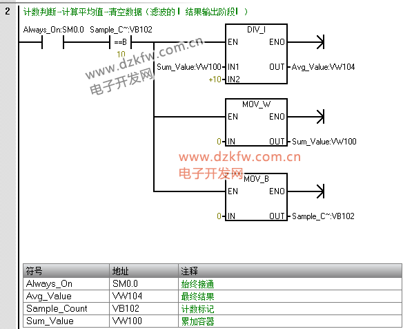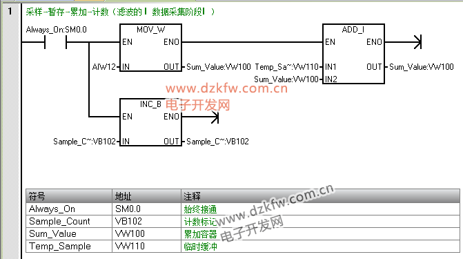 “累加容器” 作用:存储 10 次采样值的总和,需持续保留直到计算完平均值;地址选 VW100:与其他变量(Sample_Count、Avg_Value)连续分配(VW100~VW104),方便后期监控时 “批量查看滤波相关数据”(不用在分散地址间切换)。 |