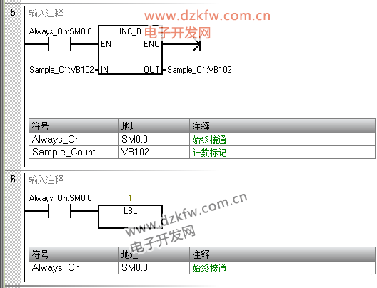 “计数标记” 作用:记录已采样次数(1~10),计数到 10 时触发平均值计算;数据类型用 BYTE:仅需计数到 10,BYTE(0~255)完全足够,比 INT 节省 1 个字节内存(工业项目中变量多时,内存优化很重要);地址 VB102:刚好是 Sum_Value(VW100=VB100+VB101)的下一个字节,地址连续,逻辑清晰。 |