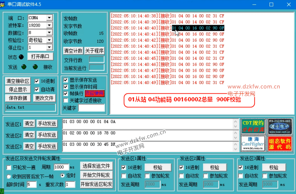 与串口调试助手通讯的代码含义,01从站 04功能码 00160002总量 900F校验