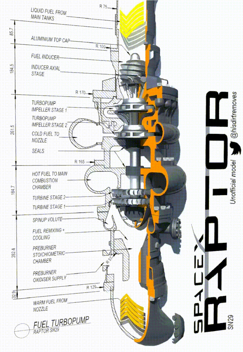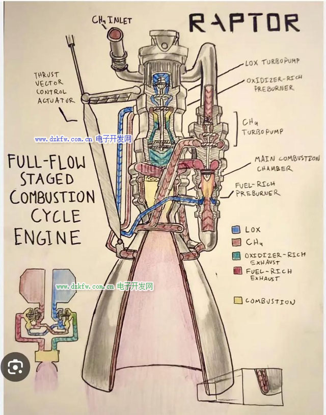 全流量分级燃烧循环:Raptor 发动机采用全流量分级燃烧循环,这与传统火箭发动机设计有显著不同。这种方法通过为燃料和氧化剂使用独立的预燃烧器,提高了效率和性能,从而改善了推力并减少了发动机质量。