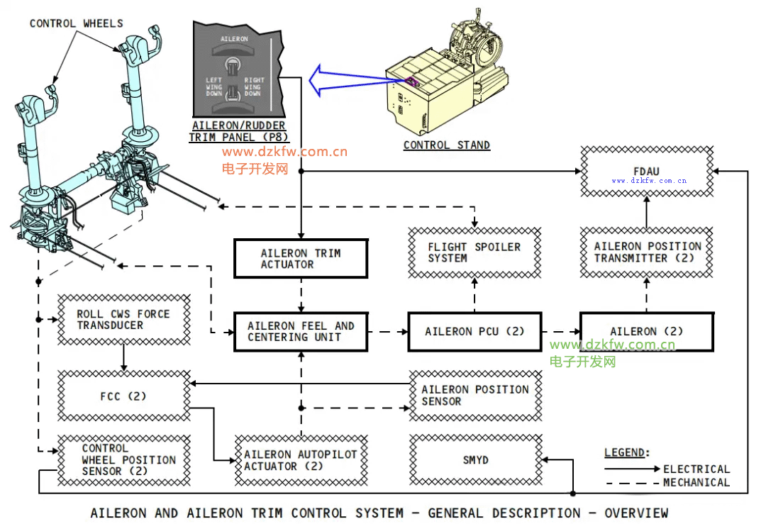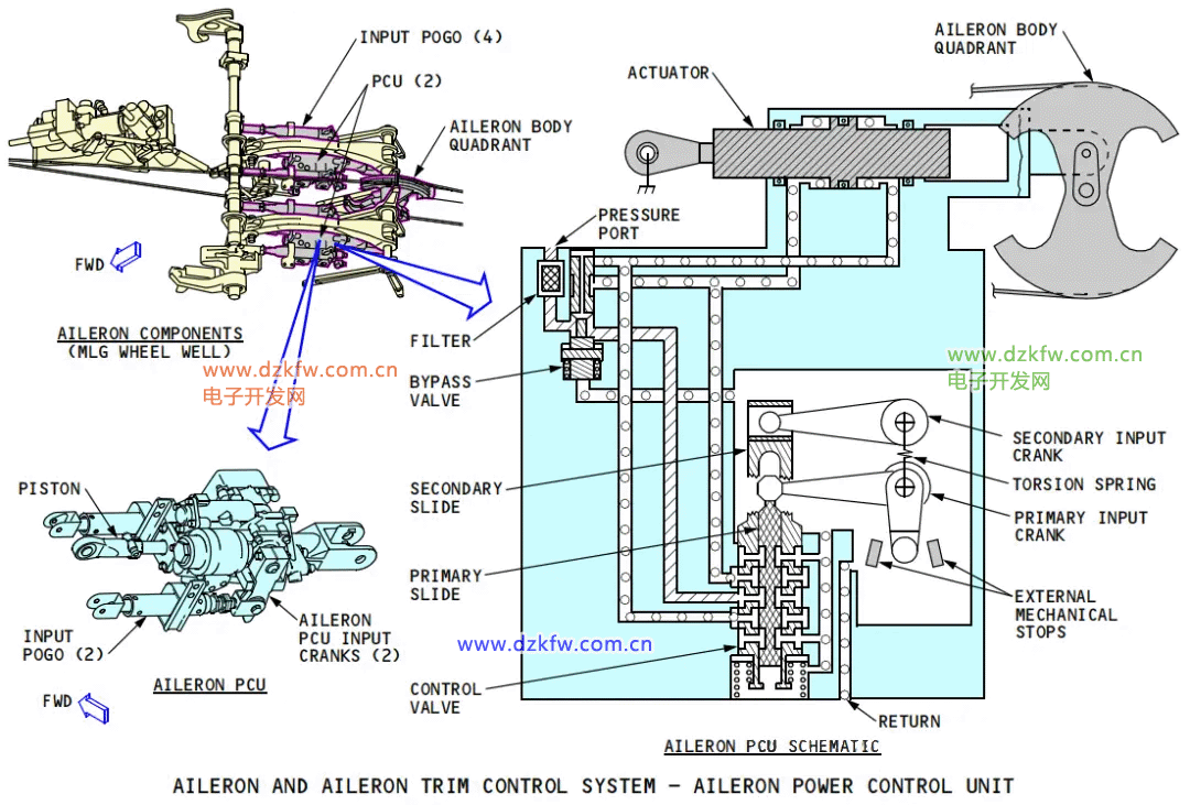 驾驶盘通过钢索和连杆向PCU提供机械输入。液压进入PCU,使外壳移动。副翼PCU运动通过机翼钢索和扇形盘机械地移动副翼。