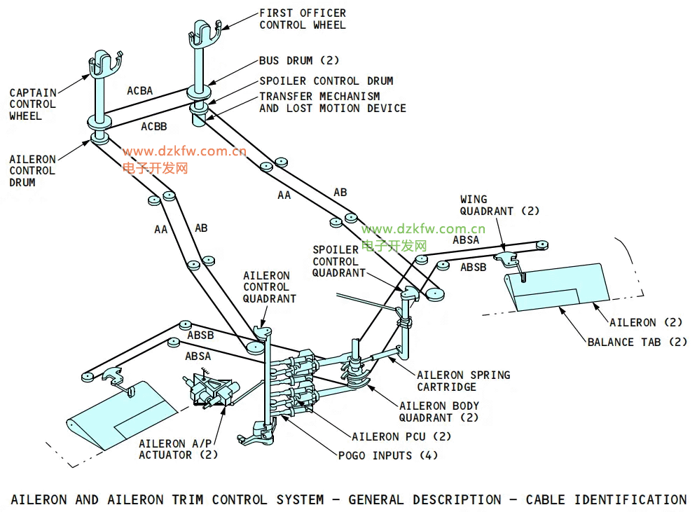 左右机翼钢索ABSA和ABSB将机身扇形盘的运动传递到机翼扇形盘,以作动副翼。