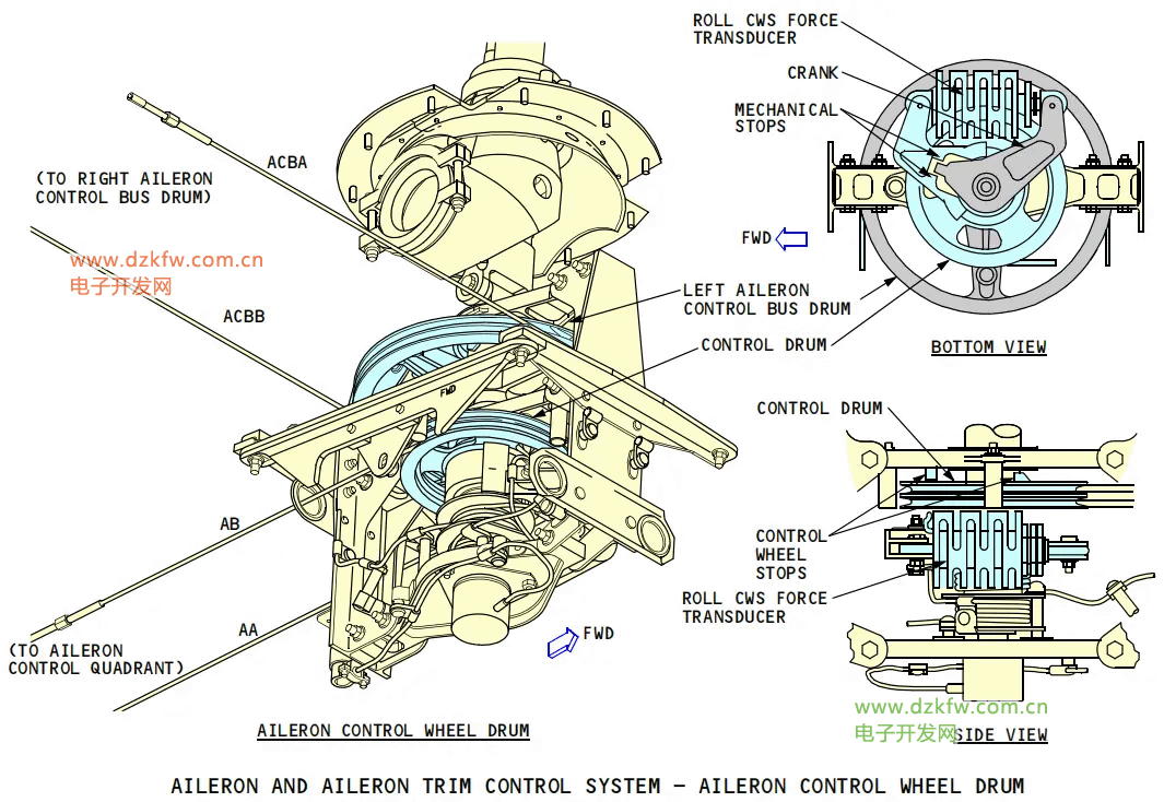 当飞行员转动驾驶盘时,轴转动曲柄。曲柄的运动通过滚转CWS力传感器到达控制鼓轮。如果滚转CWS力传感器连接有故障,机械止挡会提供保护。当控制鼓轮移动时,左机身钢索移动。驾驶盘的止挡,限制了控制鼓轮和驾驶盘的运动。滚转CWS力传感器将驾驶盘的转动力成比例的发送到飞行控制计算机(FCC)。