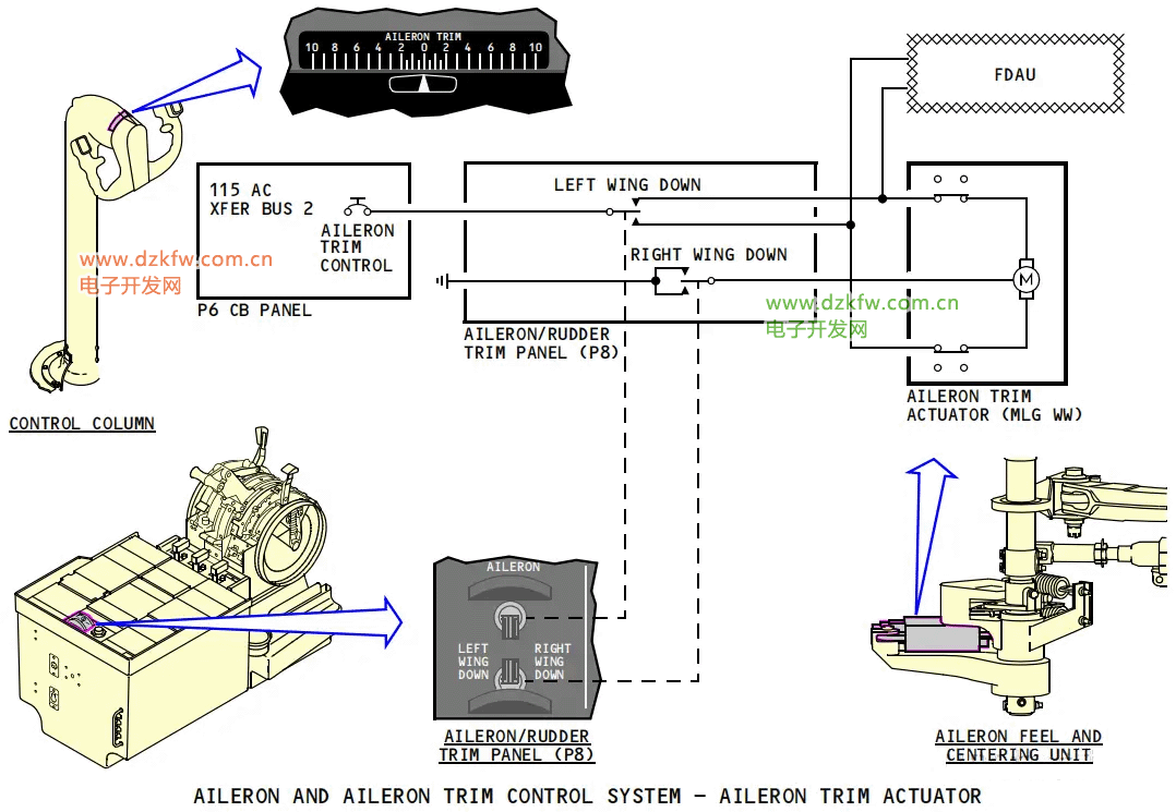 副翼配平电门和配平作动筒让机组人员平衡掉不必要的驾驶盘力。当飞行员移动副翼/方向舵配平面板上的副翼配平电门时,电门会向副翼配平作动筒和FDAU发送信号。配平作动筒移动感觉和定中组件。这个运动进入副翼PCU。副翼PCU运动通过机翼钢索机械地移动副翼和扇形盘。