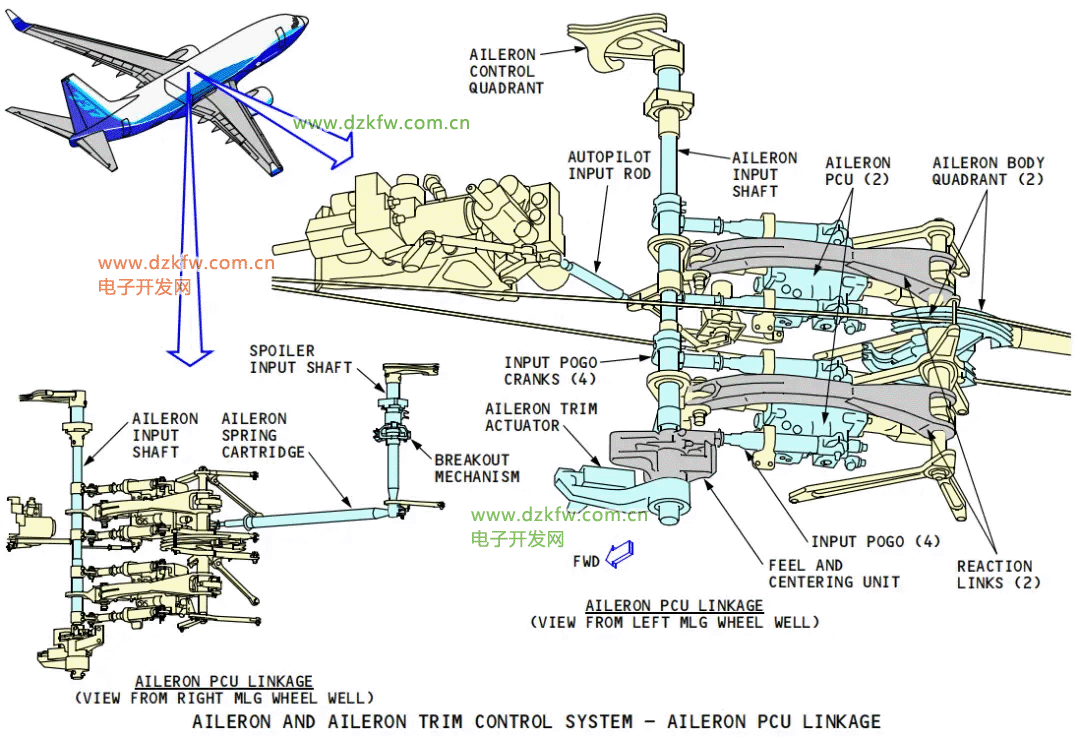 当输入轴转动时,会作动输入pogo曲柄,作动pogp杆来控制副翼PCU。两个副翼PCU杆端固定,外壳移动副翼机身扇形盘。