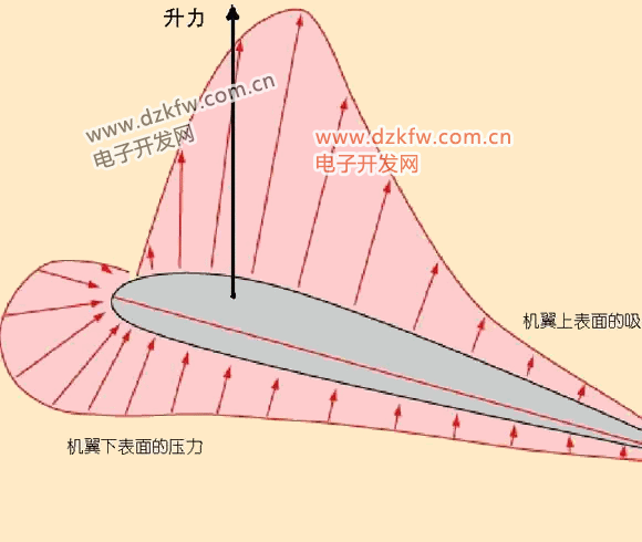 根据流体力学的基本原理,流动慢的大气压强较大,而流动快的大气压强较小。由于机翼一般是不对称的,上表面比较凸,而下表面比较平(翼型),流过机翼上表面的气流就类似于较窄地方的流水,流速较快,而流过机翼下表面的气流正好相反,类似于较宽地方的流水,流速较上表面的气流慢。大气施加与机翼下表面的压力(方向向上)比施加于机翼上表面的压力(方向向下)大,二者的压力差便形成了升力。[摘自升力是怎样产生的]。