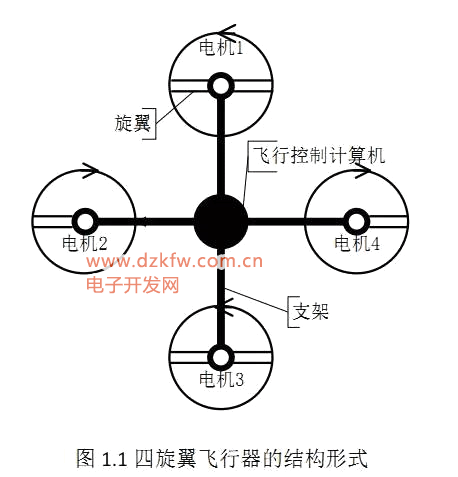 旋翼对称分布在机体的前后、左右四个方向,四个旋翼处于同一高度平面,且四个旋翼的结构和半径都相同,四个电机对称的安装在飞行器的支架端,支架中间空间安放飞行控制计算机和外部设备。结构形式如图 1.1所示。