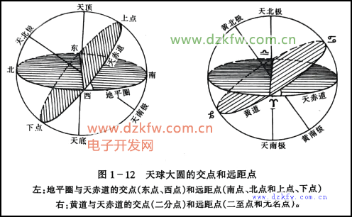 这里,首先要说明与建立天球坐标系相关的三个基本大圆,它们是地平圈、天赤道和黄道,以及各个大圆的极点和它们彼此间的交点和远距点。