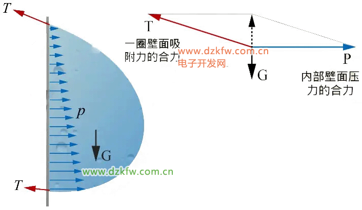 那么壁面上的水珠又是如何保持平衡?如果是固体,就是材料力学典型的悬臂结构,与重力平衡的是由壁面处的剪切力产生的。但静止流体不存在剪切力,与重力平衡的是水珠表面一圈与固体接触处的吸附力提供了向上的分力。而墙壁对水珠的支撑力则提供了向右的分力。力的平衡关系如下图所示。表面张力的作用是在水珠表面形成薄膜,包裹内部的水,水珠内部只有压力作用。