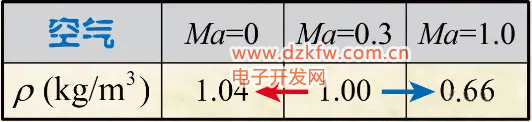 对于空气,常数R=287.06。可以看出,如果保持温度不变则密度与压力成正比。但是等温压缩并不容易实现,如气缸压缩气体时,假设气体与外界绝热,则气体分子与活塞的膨胀可以看作是弹性的,当活塞不懂时,每个分子弹回去的速度都等于撞上去的速度,相当于宏观上气体温度不变,当活塞向内运动时,与它碰撞的分子会以更快的速度弹回。它们在与气体没和活塞碰撞的气体分子碰撞,导致整个内部的气体分子热运动速度加快,于是温度上升;活塞向外运动,与此相反,会导致内部气体温度降低。如果忽略摩擦,并认为气体与外界绝热,这个压缩就是等熵压缩,实际的压缩通常接近等熵压缩,而不是等温压缩。 很显然,等温压缩更容易,因为等熵压缩导致气体温度升高,而气体温度越高抵抗压缩的力量越强。常温空气下,等温压缩系数与等熵压缩系数之比大概为 ,这个比值也成为绝热指数k,它表示等熵压缩时,密度随压力的变化程度。我们可以认为气体只在有外部压力时才存在,地表的大气是因为地球的引力才能保持一定的压力。气体永远存在向外膨胀的趋势,膨胀的速度就是分子热运动的速度。前面的讨论是针对封闭空间的压缩性,而对于开放环境的压缩性,压力如何建立?举个例子,对于刚体圆棒,从左侧推动,右侧则会以相同速度运动;对于弹簧,即使左侧不固定,也可以一定程度压缩弹簧,原因是逃跑速度不够快。因此可以认为开放环境下,即使逃走速度小于压迫速度,就会被压缩。压缩越严重,右端逃跑越快。这对应。气体被压缩后温度上升,热运动速度增大。 可压缩流动与不可压缩流动对于流体流动时,下游速度比上游慢,则处在中间的流体就会被压缩。在气流中,上游的气体以速度V压缩下游的气体,下游气体最快的逃跑速度也就是分子热运动的速度 ,宏观上就是气体的音速。马赫数 代表了流动中气体的压缩程度。空气从 减速到0密度增加4%,在工程允许的误差中,因此工程上常把 的流动当作不可压缩处理。当马赫数较大,密度变化大,可压缩性不可忽略。气体加速运动,会由于压力下降而膨胀。