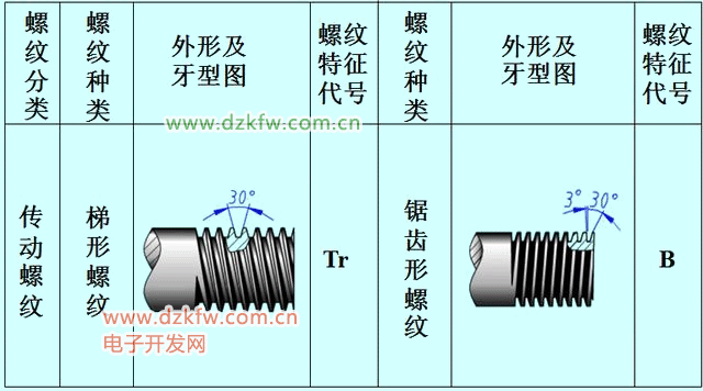在通过螺纹轴线的剖面区域上,螺纹的轮廓形状称为牙型。在工程图样中,螺纹牙型用螺纹特征代号表示。下图为常用螺纹的分类、代号、外形以及牙型。比如最常用的普通螺纹代号为M,生活中最为常见;55度非密封管螺纹G、55°密封管螺纹,在管路连接中较为常用。这些都为连接螺纹,用于连接紧固的场合。传动螺纹用于传动系统中传递动力。
