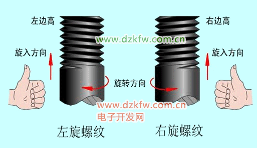下图为左旋和右旋的区分方法。简单方法就是:将螺纹立起来,右边高就是右旋,左边高就是左旋。右旋顺时针为拧紧,左旋逆时针为拧紧。
