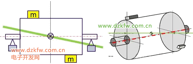 偶不平衡:当主惯性轴与旋转轴线在质心处相交并形成一个夹角α时,质心位于中心点上。然而,当转子旋转时,离心力不会作用在同一点上,就好像有人在两侧分别拉动轴一样。简单来说,偶不平衡意味着转子的质量分布在对称轴两侧不均匀,导致转子旋转时产生不平衡力。