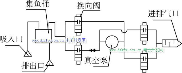 真空吸鱼泵由真空泵、集鱼桶、电气控制系统、进出软管等组成,工作时,首先关闭系统内腔各阀门进行抽气,使内部状态成真空,然后进鱼阀打开,利用真空和大气压原理将鱼吸入集鱼桶。当集鱼桶内的鱼、水总量到一定点时,限位开关送出桶内的高度信号,组合阀开始工作,原抽气工作转变为送气工作,吸鱼泵内压力增加,鱼、水通过排出阀门至容器中,实现了真空吸鱼、送鱼的目的(图3)。