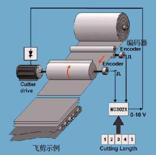 飞剪系统由旋转的刀刃对运动的进给材料按照设定的长度进行剪切,为了提高设备加工效率,要求被剪切材料保持连续进给,而不需在剪切时停顿,是工业生产领域一种常见的控制系统。其控制的难点在于:在被剪切材料高速进给的过程中,剪切刀具能严格与其同步,保证剪切出的板材长度一致。