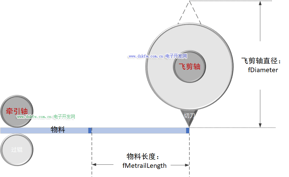 飞剪轴运行完一个周期(一把切刀一个周期就是一周360°,两把切刀一个周期就是180°,三把切刀一个周期就是120°),物料也完成一次输送。