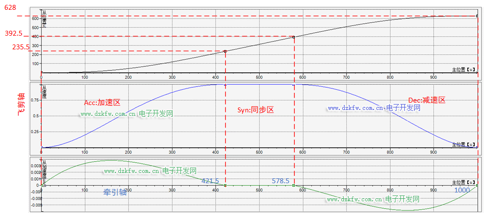 飞剪同步区运行dySyn=157。剩余628-157=471mm分配给加速区和减速区;即:
