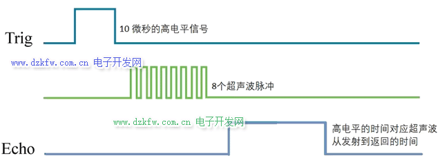 2) 8个超声波脉冲发出后,echo引脚会输出高电平。假如没有声波返回,echo引脚会在38微秒后输出低电平。假如有声波返回,echo引脚会进入低电平状态。