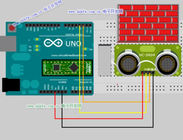 4) 已知声波在空气中的传播速度为340米/秒=34K厘米 / 秒= 0.034厘米/微秒。根据计时器的时间t, 我们可以计算出,从发射点到障碍物的距离为= 0.034厘米/微秒 * t超秒/2