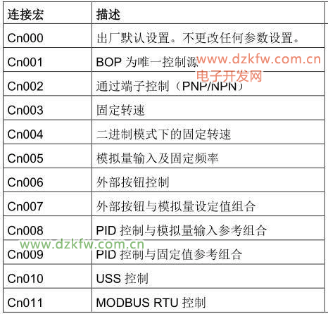 - 频率源 (P1000):设为 1 表示由操作面板上升下降键调速,设为 2 表示由模拟量输入 1 调速,设为 5 表示由 USS/MODBUS 通讯调速 。