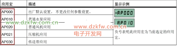 7、子菜单3,应用宏选择。设置完连接宏后,短按“M”进入应用宏选择,用于设置针对负载的类型:如风机型,水泵型等;如果负载不属于应用宏中的类型,则选择“AP000”不更改任何参数设置。