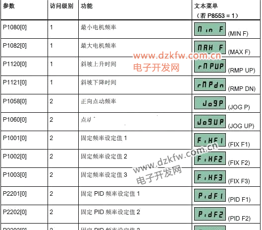 9、子菜单4,常用参数选择。设置完应用宏后,短按M键,进入常见参数设置界面,可设置最大最小频率,斜坡上升下降时间 PID调节等,如不需要可忽略,详见下表: