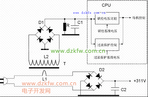 在一般的采用有电流互感器电流检测的电磁炉电路中;这个经过D1及C1整流滤波后的电压在有些电磁炉中也作为电磁炉的过流保护控制之用,当某些原因电磁炉发生异常过流现象时,L2的电压就会较大幅度的上升(大大于电磁炉正常工作时的电压),CPU内部的过流保护控制电路检测到这个上升的电压;即会判断电磁炉有故障;从而发出信号关闭电磁炉的工作。