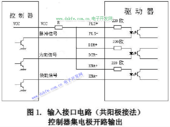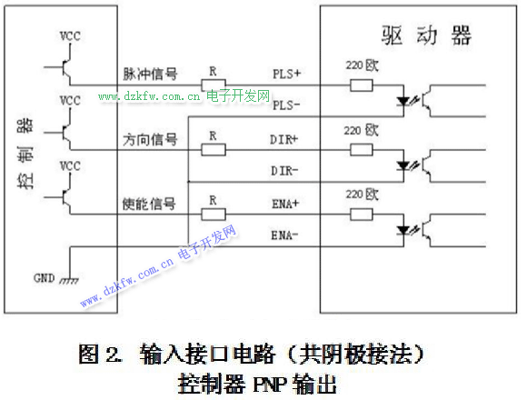 步进驱动器控制信号连接:上位机的控制信号可以高电平有效,也可以低电平有效。当高有效时,把所有控制信号的负端连在一起作为信号地,低有效时,把所有控制信号的正端连在一起作为信号公共端。
